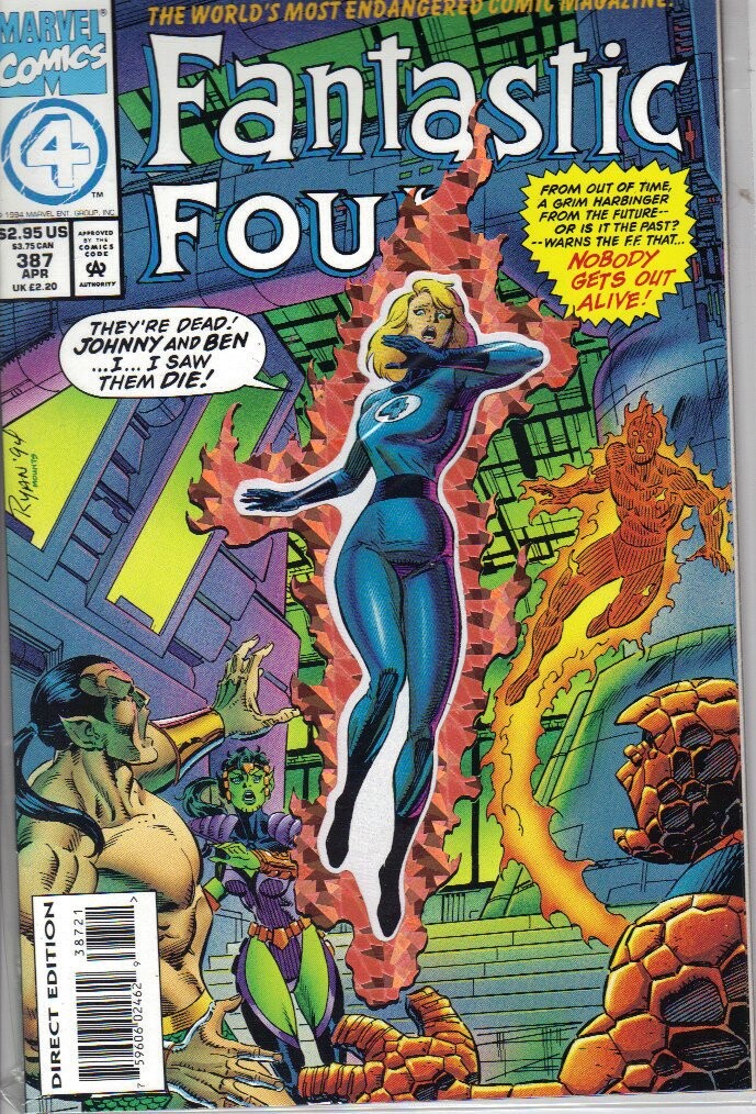 Giant-sized issue - Holo-prism Die-Cut Cover. "Nobody gets Out Alive!" Part 1 of 6. Guest-starring Namor and Ant Man (Scott Lang). Story by Tom DeFalco and Paul Ryan. Art Paul Ryan and Danny Bulanadi. Cover Paul Ryan. Johnny and Lyja talk about their baby (i.e. egg). Plus, an ominous warning from the future tells the Fantastic Four that their fates are sealed. This sets the team off on one of their most epic adventures yet. All this and the enigmatic Watcher too.
