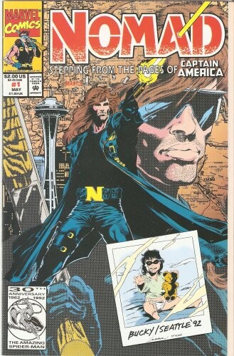 Cover pencils by Samuel Clarke Hawbaker, inks by Mark McKenna. Stepping from the pages of Captain America. 3-page fold-out "Wanted" poster. "The Favor Banker," written by Fabian Micieza, pencils by S. Clarke Hawbaker, inks by Mark McKenna, letters by Chris Eliopoulos, color by Joe Rosas; Origin of Nomad--Jack Munroe begins his new career in Seattle, as a hired vigilante, while caring for his adopted daughter, Bucky. 2-page spread for "Marvel Master Vision" game. Includes "Bullpen Bulletins." 32 pages, full color.